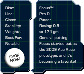 The 2009 Ace Race proto is now the versatile Focus. This bullet-nosed brute fills a gap in Discraft's putter line up, being our only 0.5 putter. Focus will cut moderate winds on long approaches, and delivers pinpoint accuracy all the way to the chains.