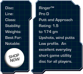"Ringer features a low profile and great stability that is able to handle the torque of sidearm approaches. If I'm within 150 feet of the pin, chances are I'm using a Ringer. Great for windy days and calm conditions alike, this disc is not easily swayed from its intended path of action"