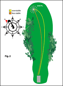 The wind is AD and more A than D [FIG 2]. Throwing an overstable disc with anhyzer allows a straighter and higher flight path to be taken. This is because the anhyzer tilt of the disc at release will prevent the crosswind from lifting it. Because a less stable disc will be thrown with a hyzer angle, the crosswind effects (D) will push and lift, making it necessary to start the disc wider and play (guess) how much push it will receive. Because of the tailwind, lessen the stability from what you would normally throw on a calm day.